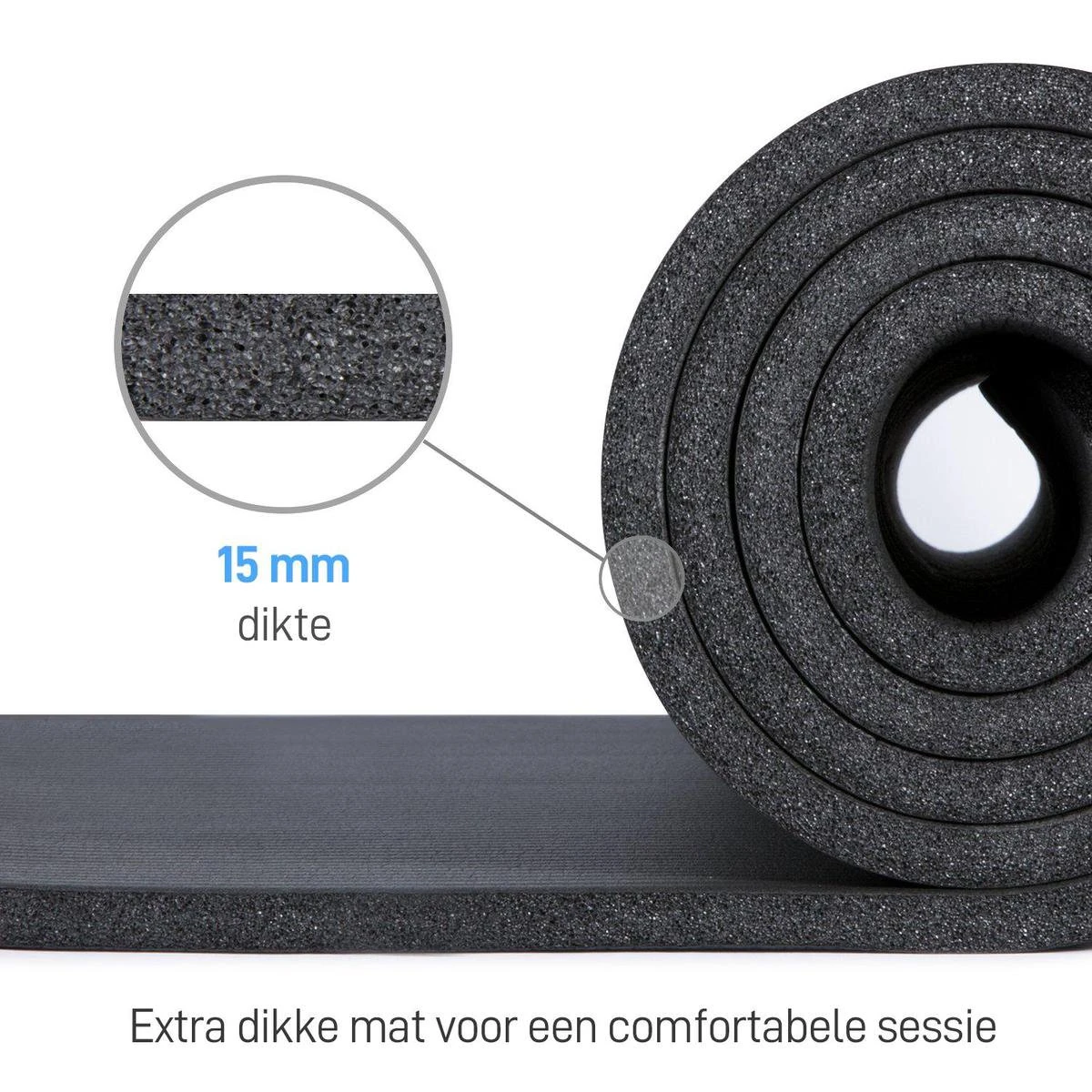 De dikke 15 mm fitness/yogamat kan fijn zijn om verschillende redenen. Ondersteuning van gevoelige gewrichten, een warme ondergrond of simpelweg een ondergrond met goede en comfortable demping ter ondersteuning van alle soorten sport oefeningen.