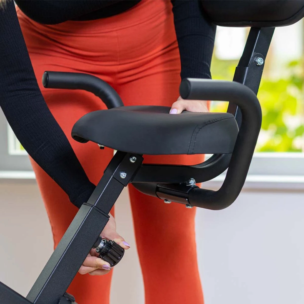 Pas de hoogte van het extra grote zadel met rugleuning aan voor een comfortabele zitpositie, en maak uw voeten vast in de verstelbare voetriemen. Kies een goede plek voor uw handen op het multi-positie stuur, leun achterover en begin een aangename fietstocht. De rugleuning zorgt ervoor dat uw rug niet onnodig belast wordt. Op het display kunt u uw hartslag volgen tijdens de training, door eenvoudig uw handen op de sensoren op het stuur te plaatsen. Naast uw hartslag staan leest u hier ook de snelheid, tijd, afstand, calorieverbruik en totaal afgelegde afstand af.