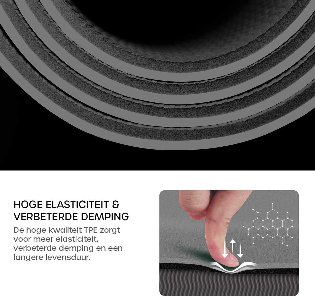 ▶ Thermoplastisch elastomeer (TPE): De yoga mat is gemaakt van de hoogste kwaliteit TPE. Dit zorgt ervoor dat de yoga mat comfortabel en stevig aanvoelt.