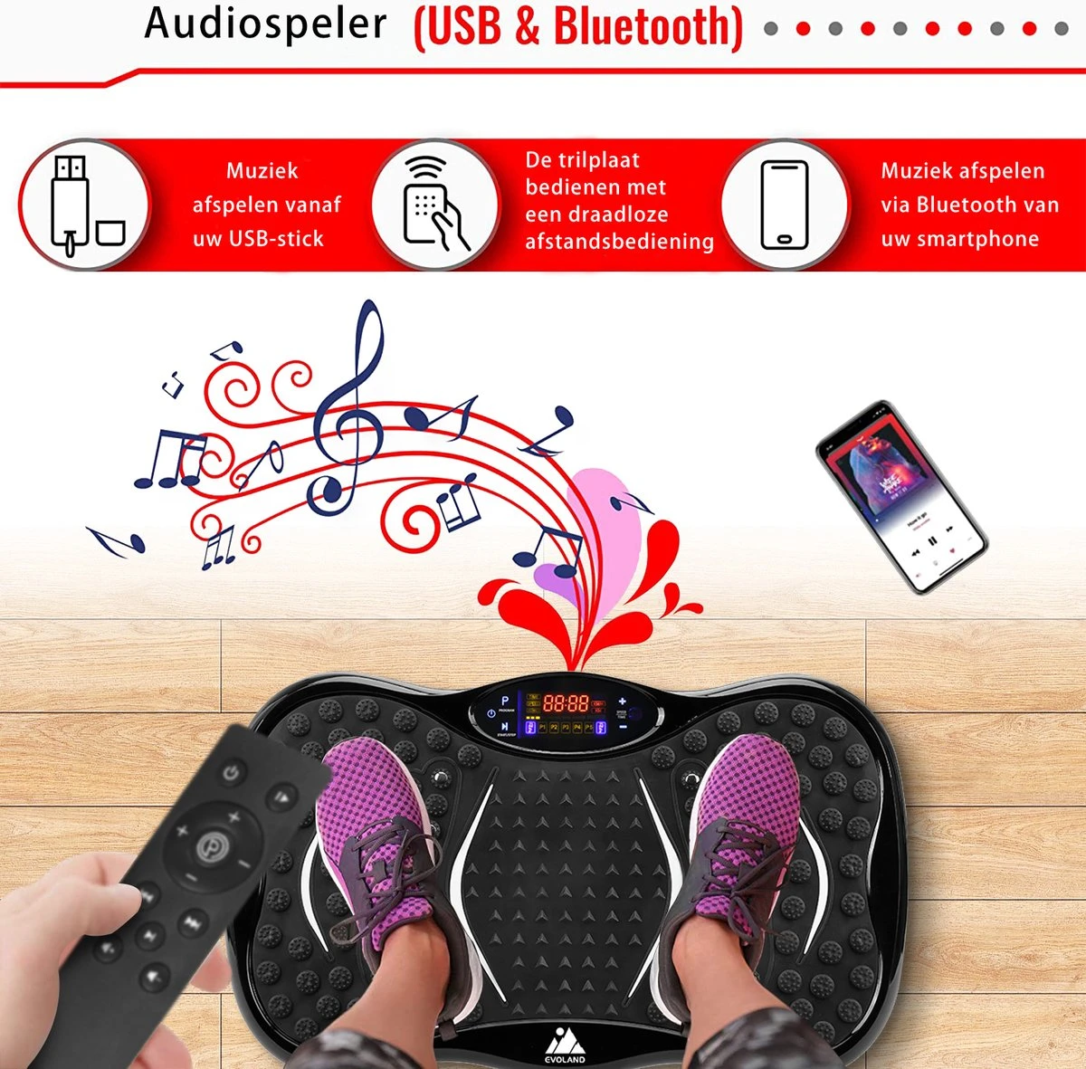 De EVOLAND is een innovatieve trilplaat voor thuis en werkt middels de bewezen wetenschappelijke vibratietechnologie. Dankzij de 700-800 aanspanningen per minuut Trillingsamplitude 10-12 mm worden effectieve bewegingen gegenereerd. Doordat de spieren in je lichaam zich dankzij de trillingen automatisch aanspannen wordt een optimaal trainingsresultaat gerealiseerd en de vetverbranding en bloedcirculatie verbeterd. De EVOLAND fitness trilplaat is voorzien van een Bluetooth-functie met handgrepen en elastische weerstandsbanden.