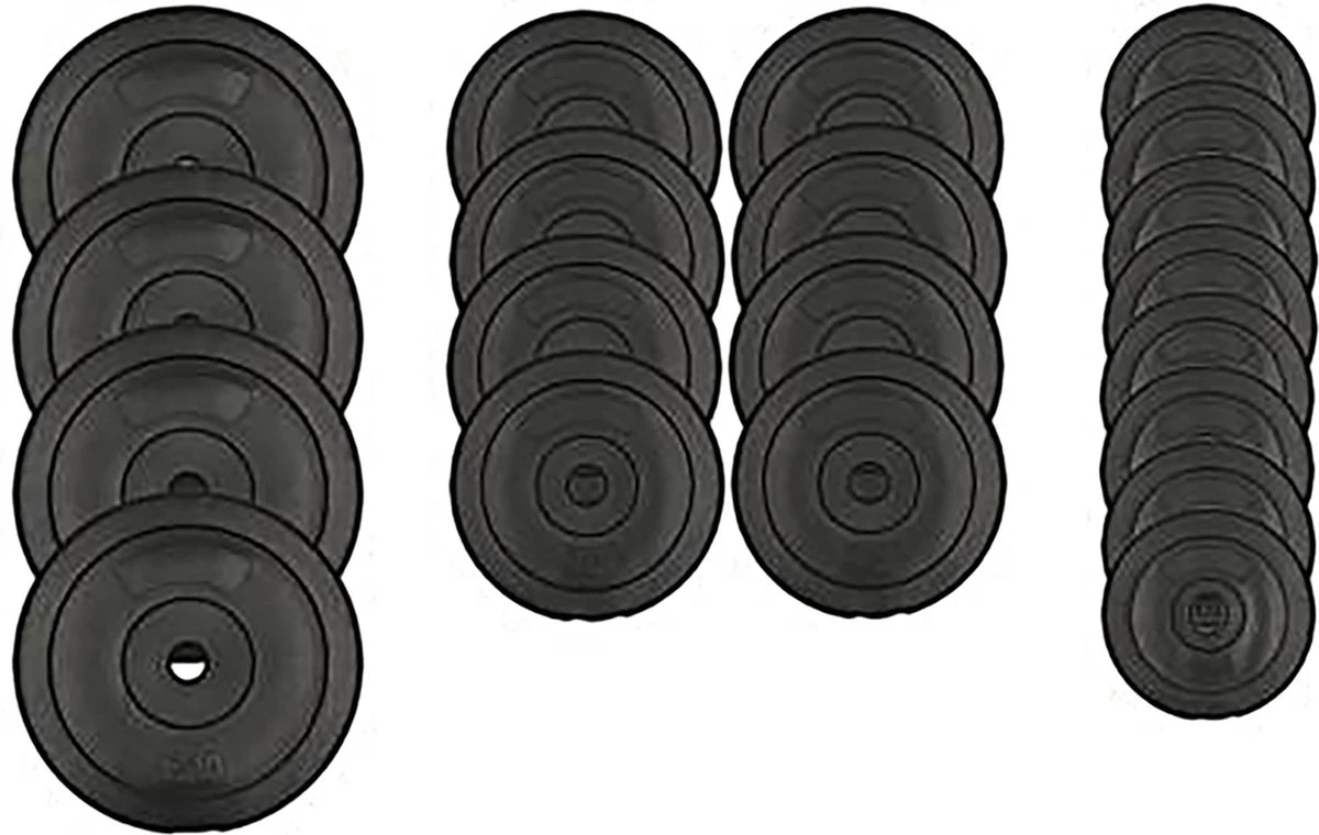 De meegeleverde halterschijven hebben een totaal gewicht van 50 kg exclusief de stangen. Met deze set kan de gebruiker zelf kiezen hoeveel gewicht hij wil tillen voor verschillende oefeningen. De schijven zijn gemaakt van cement met een kunststof huls, ze kunnen makkelijk op de halter vergrendeld worden met de meegeleverde veersloten. Het gewicht van elke schijf staat er duidelijk op vermeld, voor snelle en makkelijke identificatie.