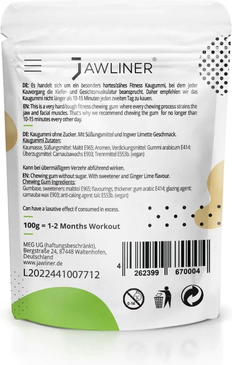Wereldwijd gebruikt door artsen en orthodontisten: Onze fitness kauwgom wordt wereldwijd door tal van medische professionals gebruikt voor behandelingen aan de kaaklijn. Wij benadrukken: Het is een speciale kauwgom met een super sterk trainingseffect op je hele gezichtsspieren. Daarom raden wij u aan om maximaal 10-15 minuten om de dag te trainen.