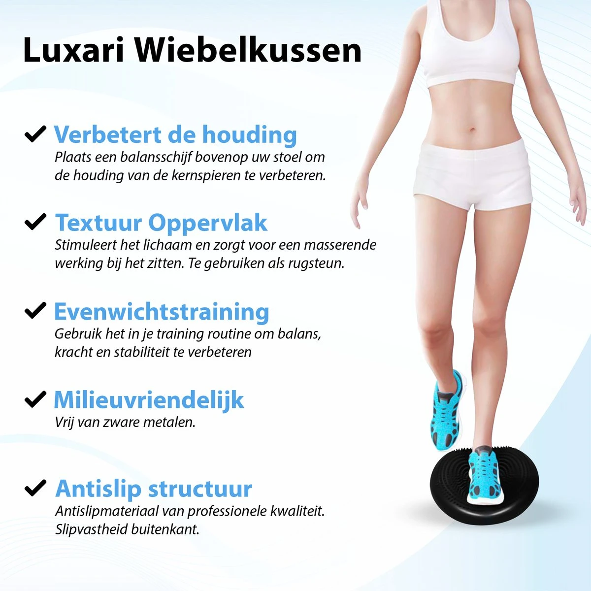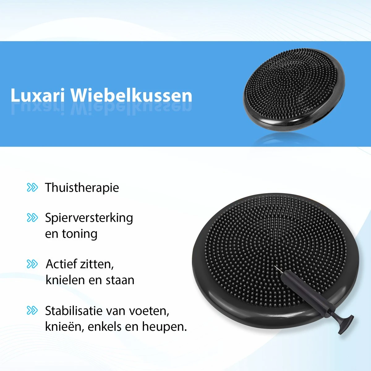 De Luxari Wiebelkussen wordt geleverd inclusief pomp. Hiermee kunt u de wiebelkussen oppompen of leeg laten lopen om de wiebelkussen af te stellen naar de behoeftes van de gebruiker. Hierdoor kan de wiebelkussen ook door verschillende personen gebruikt worden.