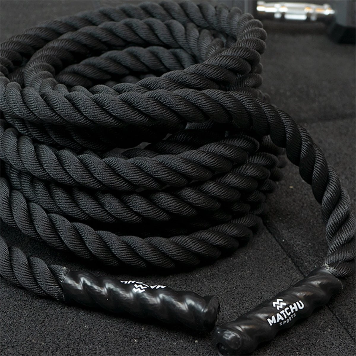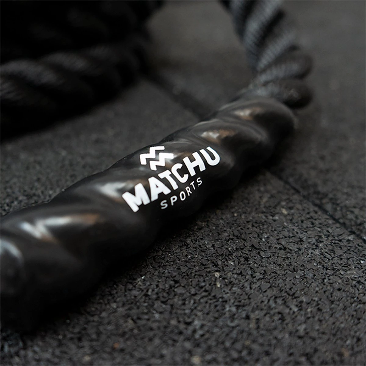 Battle rope van Matchu Sports. Trainen met battle ropes is over komen waaien vanuit de Verenigde Staten, waar ze veel gebruikt worden door football spelers en MMA vechters. Ondertussen wordt de battlerope ook veel gebruikt binnen crossfit en fitness, om een leuke en intense variatie op gebruikelijke cardiotraining te geven.
