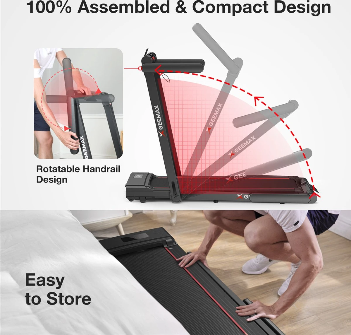 [100% draagbare 2-in-1 loopband voor onder het bureau!] Vergeleken met andere loopbanden is onze 2-in-1 loopband direct uit de doos verkrijgbaar zonder enige installatie! Het heeft 2 modi om aan uw verschillende sportbehoeften te voldoen zonder enige demontage! Wanneer de leuning is ingeklapt, kan deze worden gebruikt als joggingmachine met een snelheid van 0,6-6,7 km/u. Wanneer de leuning omhoog staat, is de loopsnelheid 0,6-7,5 mph. Je bedient de loopband eenvoudig met de slimme handgreep, de mobiele app of de afstandsbediening zoals jij dat wilt.