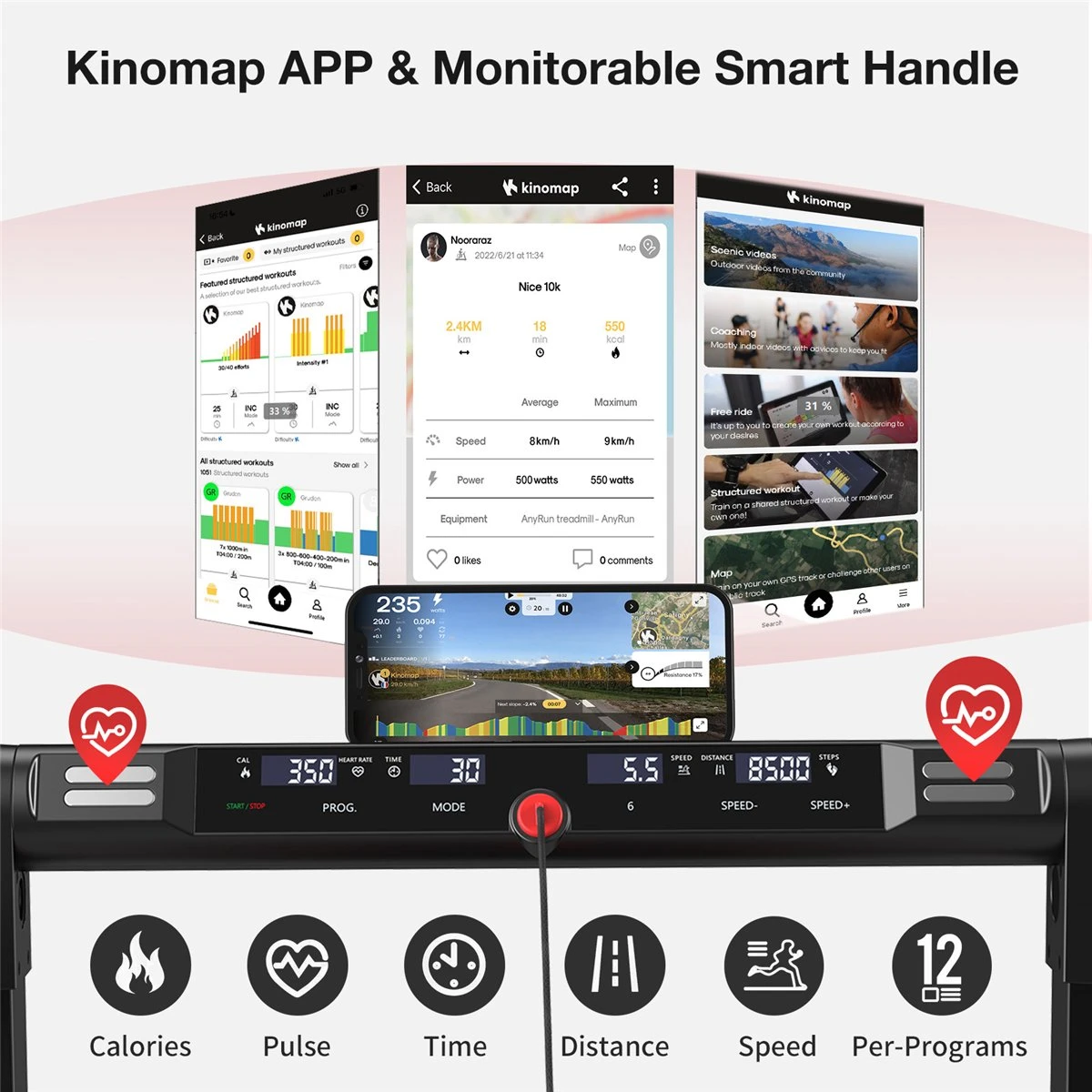 [SMART-bedieningshendel & Bluetooth-luidspreker & APP-bediening & LED-display] Slimme bedieningshendels worden geleverd met hartslag. Met de Bluetooth-luidspreker en telefoonstandaard kunt u uw telefoon gebruiken om de Kinomap-app te koppelen om de loopband te bedienen en de baan te bekijken, wat fitness nog leuker maakt. Zowel het handvat als de motorkap hebben een LED-display, handig voor het volgen van gegevens in twee modi. Ondertussen biedt het 12 vooraf ingestelde programma’s die u kunt selecteren om uw trainingsdoelen te bereiken.