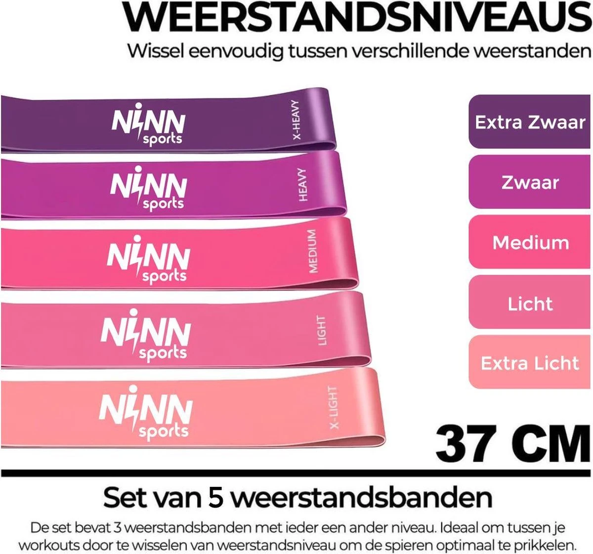Je ontvangt een set met 5 hoogwaardige kwaliteitsbanden van 100% natuurlijk latex. Afhankelijk van de kleur die je gebruikt, train je lichter of zwaarder. Zo bepaal jij zelf het weerstandsniveau. Probeer wat voor jou het beste aanvoelt en begin met een wat lichtere band. Zodra je het onder de knie hebt, kan je met een steeds zwaardere band gaan trainen.