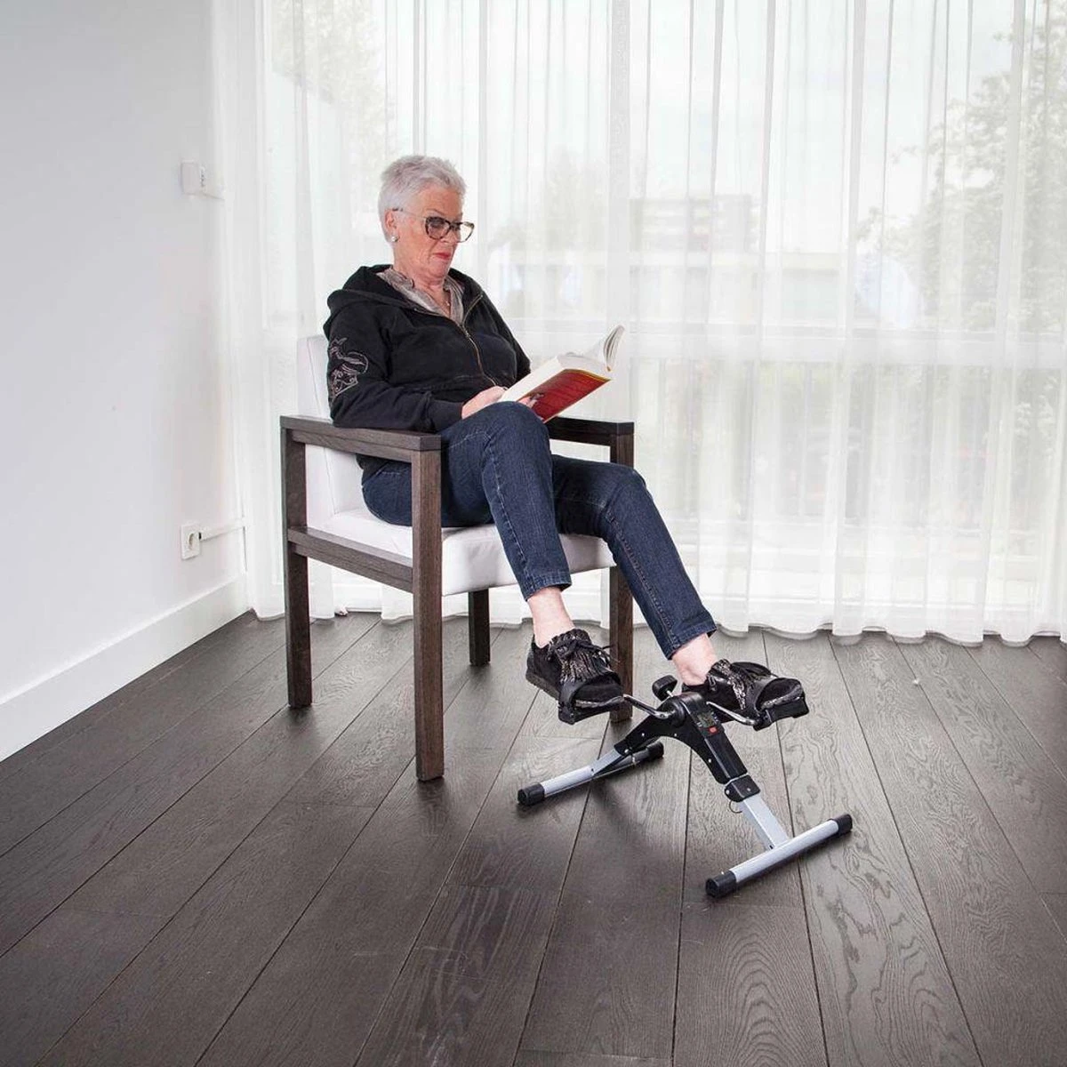 Altijd fit en in conditie dankzij deze mobiliteitstrainer. Een gebrek aan tijd is geen excuus meer. Deze bewegingstrainer is volledig inklapbaar en neemt u overal met u mee. Geschikt voor thuis , op de bank voor de televisie, maar ook op uw werk of op vakantie. De stoelfiets houdt u mobiel, fit en gezond. Bovendien is de stoelfiets een uitstekende hulp bij revalidatie.