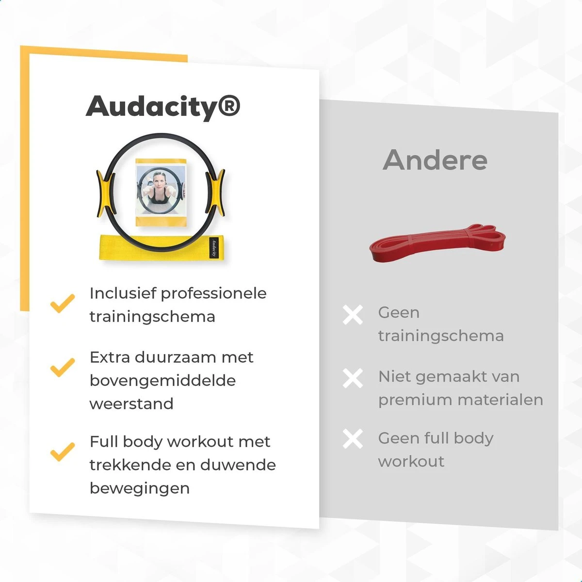 De Audacity Pilates set combineert topkwaliteit met fraai design. Klik op ”in winkelwagen” en neem niet langer genoegen met tweederangs namaak producten.