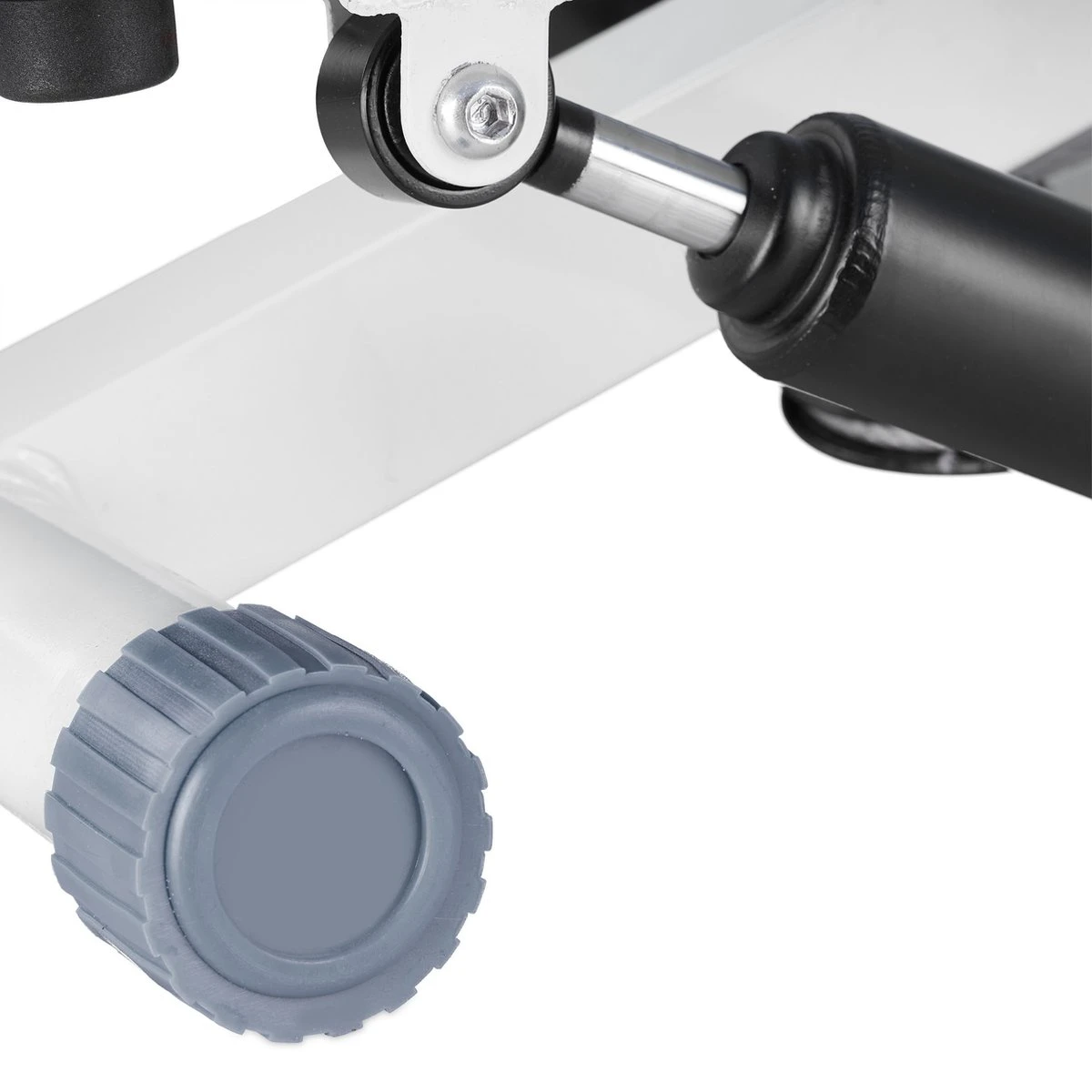 Opmerking: De kunststof voetjes kunnen in de hoogte versteld worden door eraan te draaien. Zo pas je de hoogte van de stepper aan de grond aan en voorkomt je dat hij wankelt.