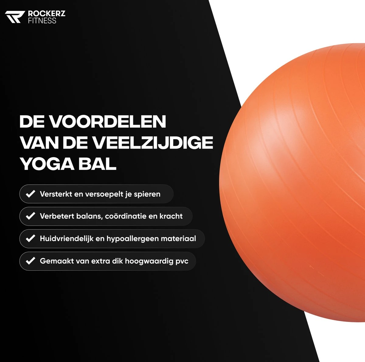 Deze veelzijdige bal van Rockerz Fitness is er niet alleen voor yoga, want het is ook een fitness bal, gym bal en een pilates bal. De bal wordt namelijk ook veel gebruikt voor fitness- en pilates oefeningen, zowel thuis als in de sportschool. Doordat de bal op veel manieren inzetbaar is, kan je er je buik, benen, billen, armen en rug uitstekend mee trainen. De hoeveelheid aan oefeningen is ontelbaar. De fitnessbal is makkelijk in gebruik en licht van gewicht. Ook wordt hij vaak gebruikt bij revalidatie-oefeningen om na een blessure de stabiliteit en kracht in de spieren terug te trainen.