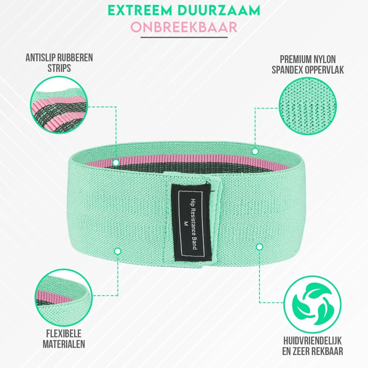 De weerstandsbanden variëren van ca. 8 kg weerstand tot 32 kg weerstand. Het bandje in de blauwgroene kleur heeft de minste weerstand en het paarse bandje heeft de meeste weerstand. De lichtere weerstandsband kun je bijvoorbeeld gebruiken voor revalidatie, stretching, flexibiliteit en warming-up. De banden met meer weerstand zijn meer geschikt voor een full-body workout, conditietraining, krachttraining, balans, spiergroei en het trainen van ronde billen.