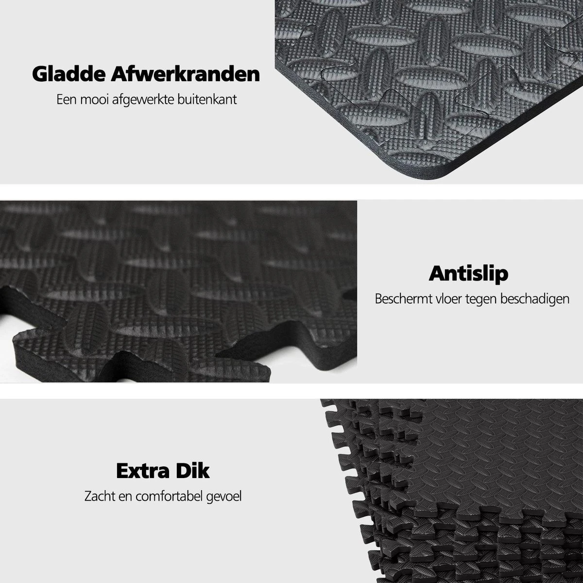 Bestaande uit 48 puzzelmatten en randstukken voor de perfecte vloerbescherming. Bescherm uw vloer tegen krassen, stoten, deuken, kou, lawaai, zweet en andere vloeistoffen met de meest veilige en best beschermende vloermat die op de markt verkrijgbaar is. Volledig BPA-vrij voor uw veiligheid en welzijn.