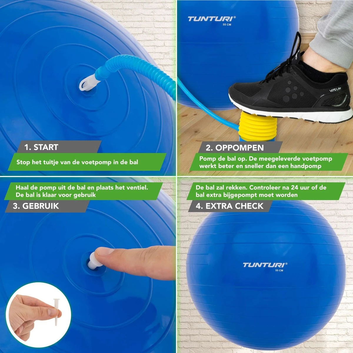Doe thuis je fitness oefeningen met de Tunturi yoga bal. Blaas simpelweg de fitness bal op en start gelijk met je training. Verbeter je coördinatie, balans en kracht tijdens het werken of sporten met deze fitness bal. Ideaal voor thuis, maar wordt ook veel gebruikt in yoga- en sportscholen en revalidatiecentra.