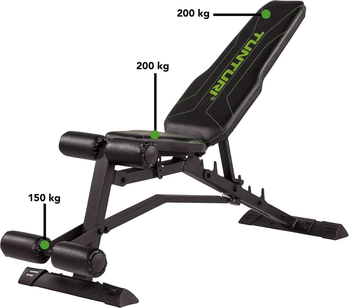 Het maximale belastbare gewicht voor de halterbank is 150 kg.