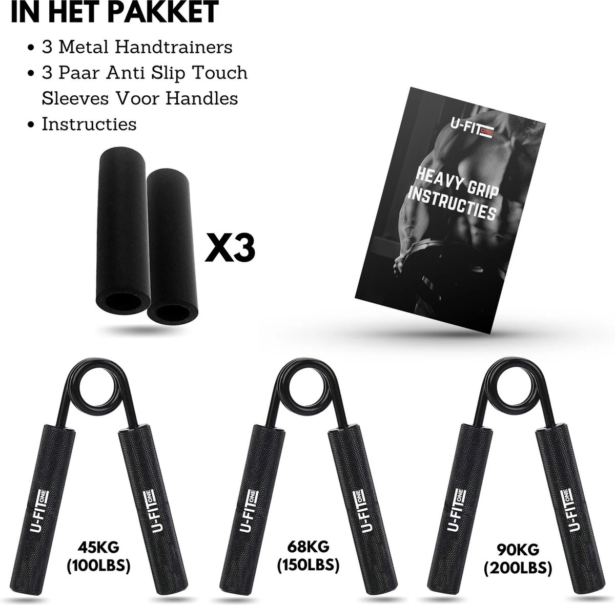 In het pakket: 3 handtrainers(45kg, 68kg, 90kg) , 3 afneembare soft cushions