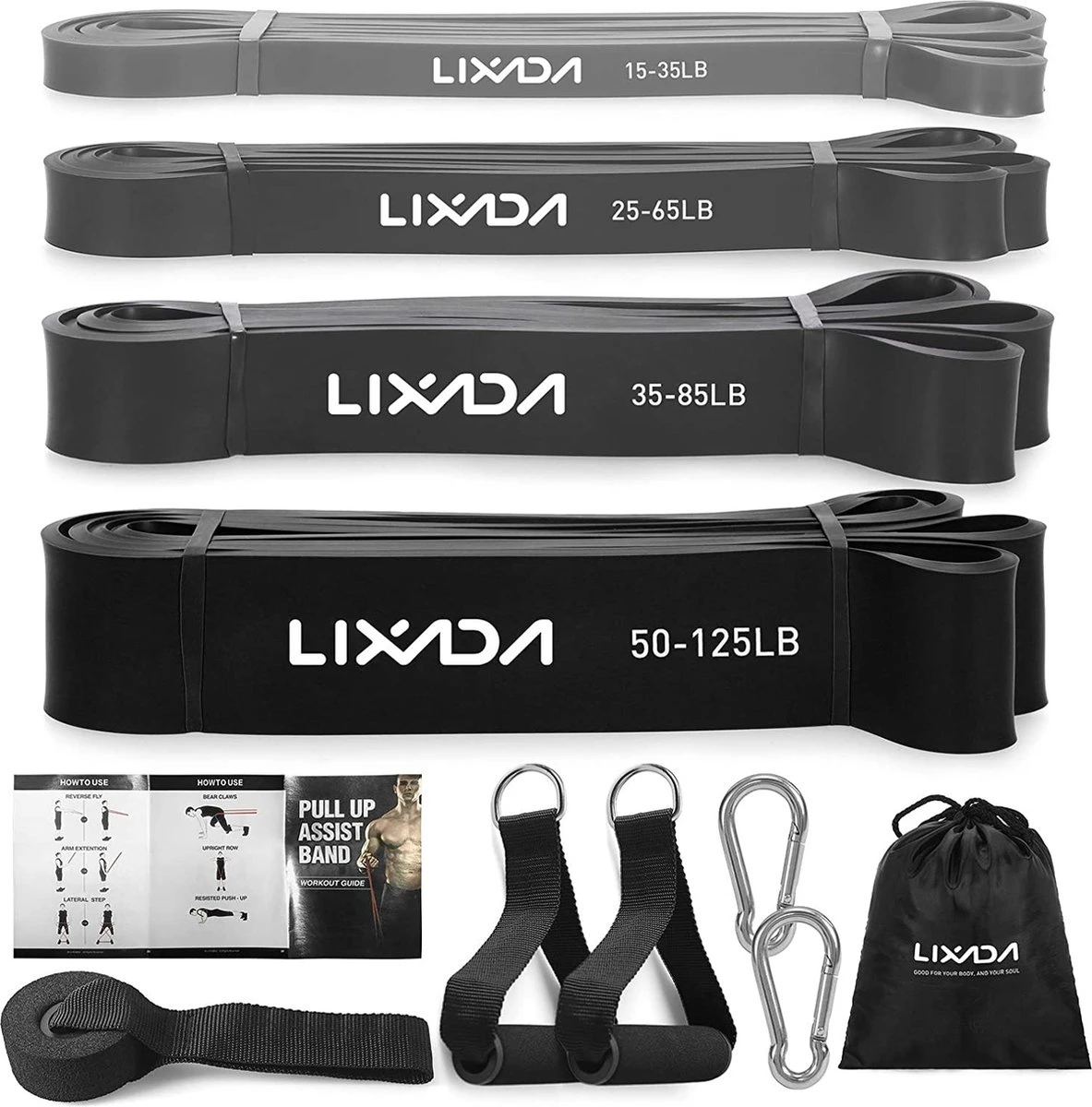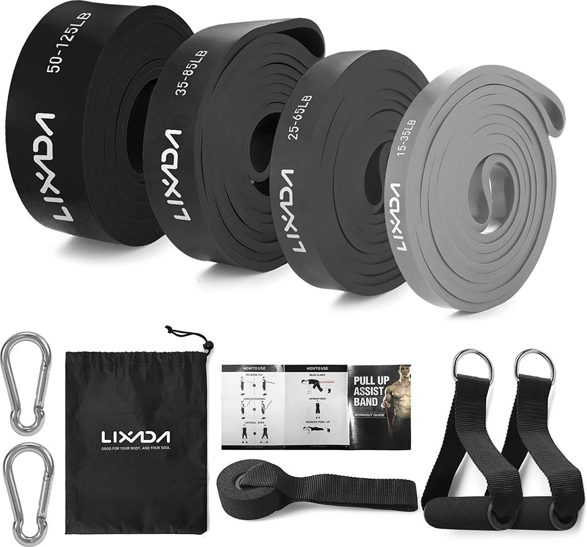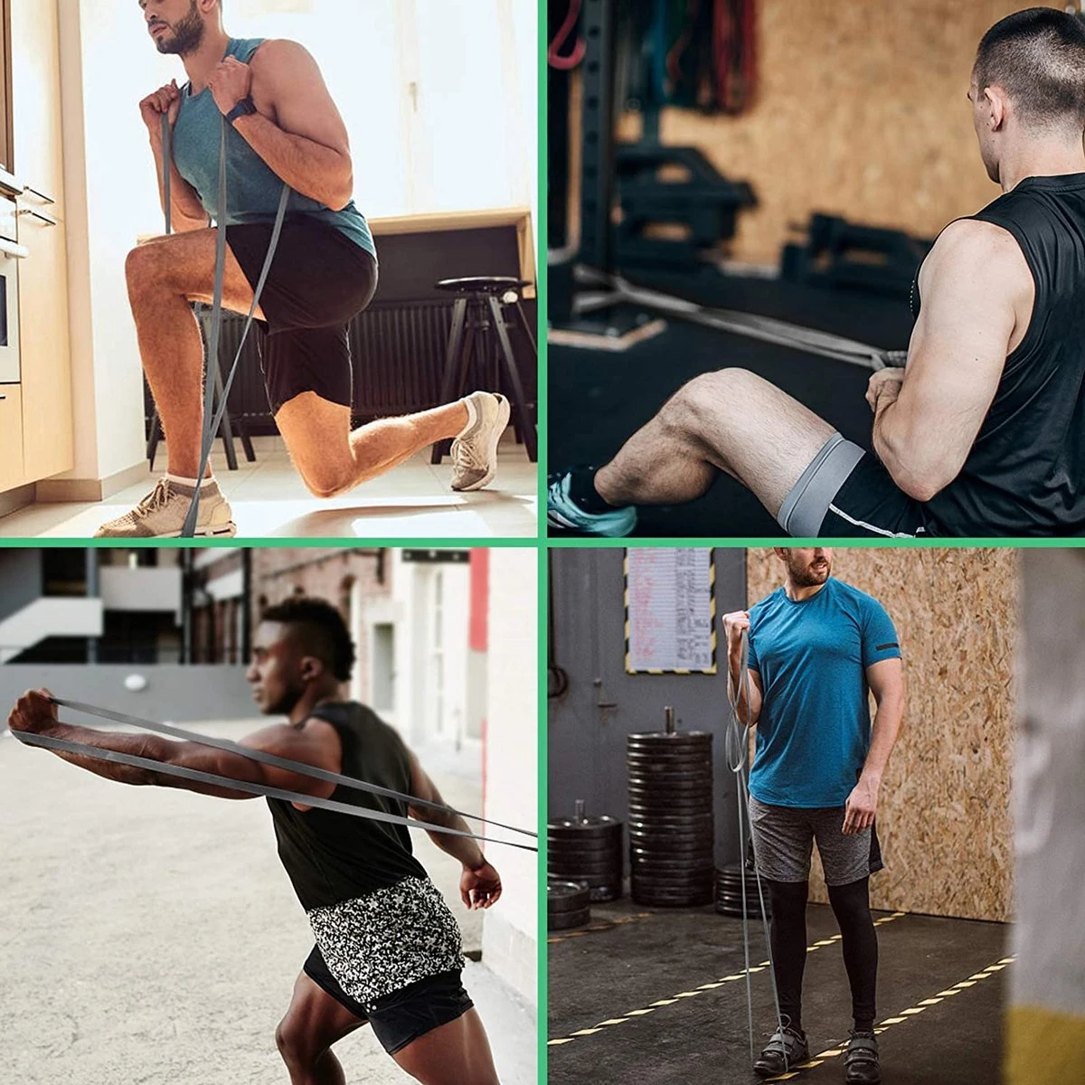 - 【4 stuks fitnessbanden met verschillende kleuren en spanningsgebieden】: grijs 15-35 lb. grijs 25-65 LB, grijs 35-85 LB, zwart 50-125 LB. Gebruik een enkele frequentieband of combineer meerdere frequentiebanden om een uitdagende trainingsintensiteit uit te voeren.