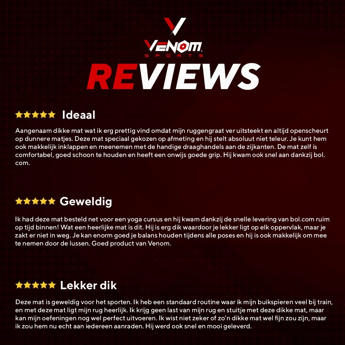 Venom Sports® is gemaakt voor én door de Nederlandse fitness liefhebber. De producten van Venom Sports® zijn zorgvuldig ontworpen voor de (thuis)sporter. Bij het ontwerpen en samenstellen van de producten is nauwlettend gedacht aan grip, vorm en materialen, zodat iedere beginnende en gevorderde sporter gebruik kan maken van de Venom Sports® artikelen. De gym producten zijn uitsluitend gemaakt van duurzame en sterke materialen, zodat jij elke dag opnieuw kan werken aan jouw sportieve doelstellingen. Venom Sports® is een ervaren e-commmerce leverancier in sportartikelen, zo kunt u altijd contact opnemen met de klantenservice en rekenen op de snelst mogelijke levering.