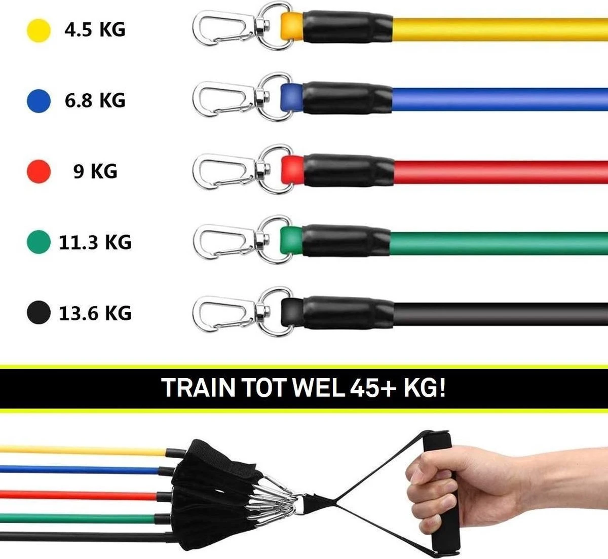 Met de XSTRONG Weerstandsbanden met handvaten en fitness elastieken set haal jij je eigen personal gym in huis. De resistance band/tube set is zo ontworpen dat deze geschikt is voor sporters van ieder niveau. De set biedt je de mogelijkheid om een volledige full-body workout uit te voeren thuis of onderweg. Bij deze set ontvang je een gratis draagtas en instructie flyer, hiermee haal je direct alle informatie en oefeningen in huis om te starten met trainen en/of om je (kracht)training te intensiveren. Ook geschikt voor Fysiotherapie en Chiropractie oefeningen