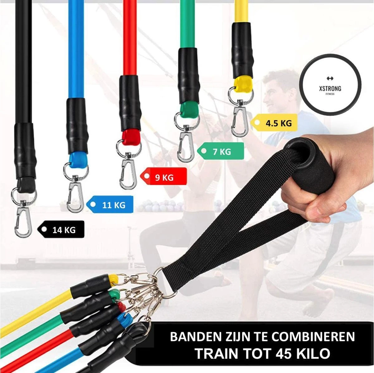 De set bestaat onder ander uit vijf elastische fitness banden, gemaakt van 100% natuurlijk dubbelwandig latex voor extra veiligheid. Dankzij de verschillende weerstandskrachten van de banden kunt je je trainingsschema gemakkelijk opbouwen. Start bijvoorbeeld met 5 kg en bouw dat op tot wel 45 kg. Je kunt zelfs meerdere banden tegelijk gebruiken, de opties zijn ontelbaar! De verschillende weerstandsbanden zijn makkelijk te onderscheiden dankzij de verschillende kleuren. Met deze banden kun je thuis of onderweg een fullbody workout (gehele lichaam trainen) uitvoeren. Gebruik ze bijvoorbeeld voor je borstspieren, je rugspieren, beenspieren, bekken, biceps, triceps, kuitspieren en nog veel meer! Kortom, met een ijzeren discipline en deze fitness set van XSTRONG ben je binnen een mum van tijd uiterst fit!