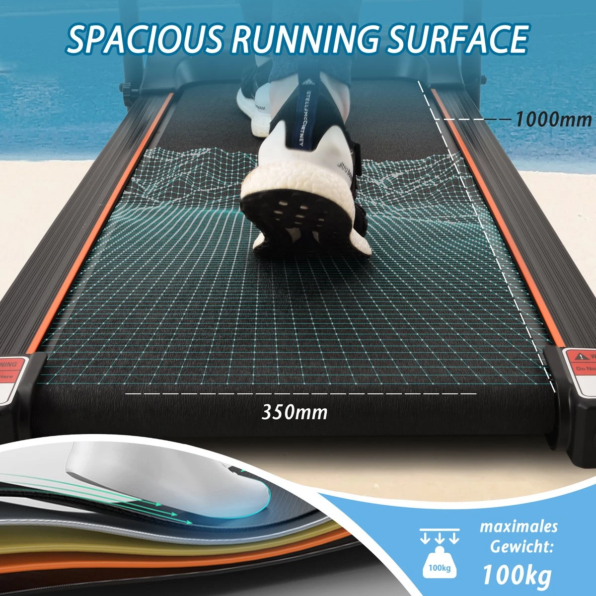 Met een afmeting van 35×100 cm is de loopband comfortabel om geschikte ruimte te bieden voor vrolijk hardlopen.